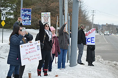 Music was playing, as demonstrators shouted, “power to the students,” “no justice, no peace, no ICE in our streets,” “no one is illegal on stolen land,” and “when I say ‘ICE’ you say ‘out,’ ICE out.” Cars and trucks honked in support as they passed on Valley Forge Road.