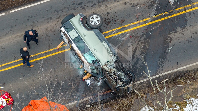A gold SUV lost a wheel in the crash, overturned onto its side and was leaking fluids, with severe front-end damage.