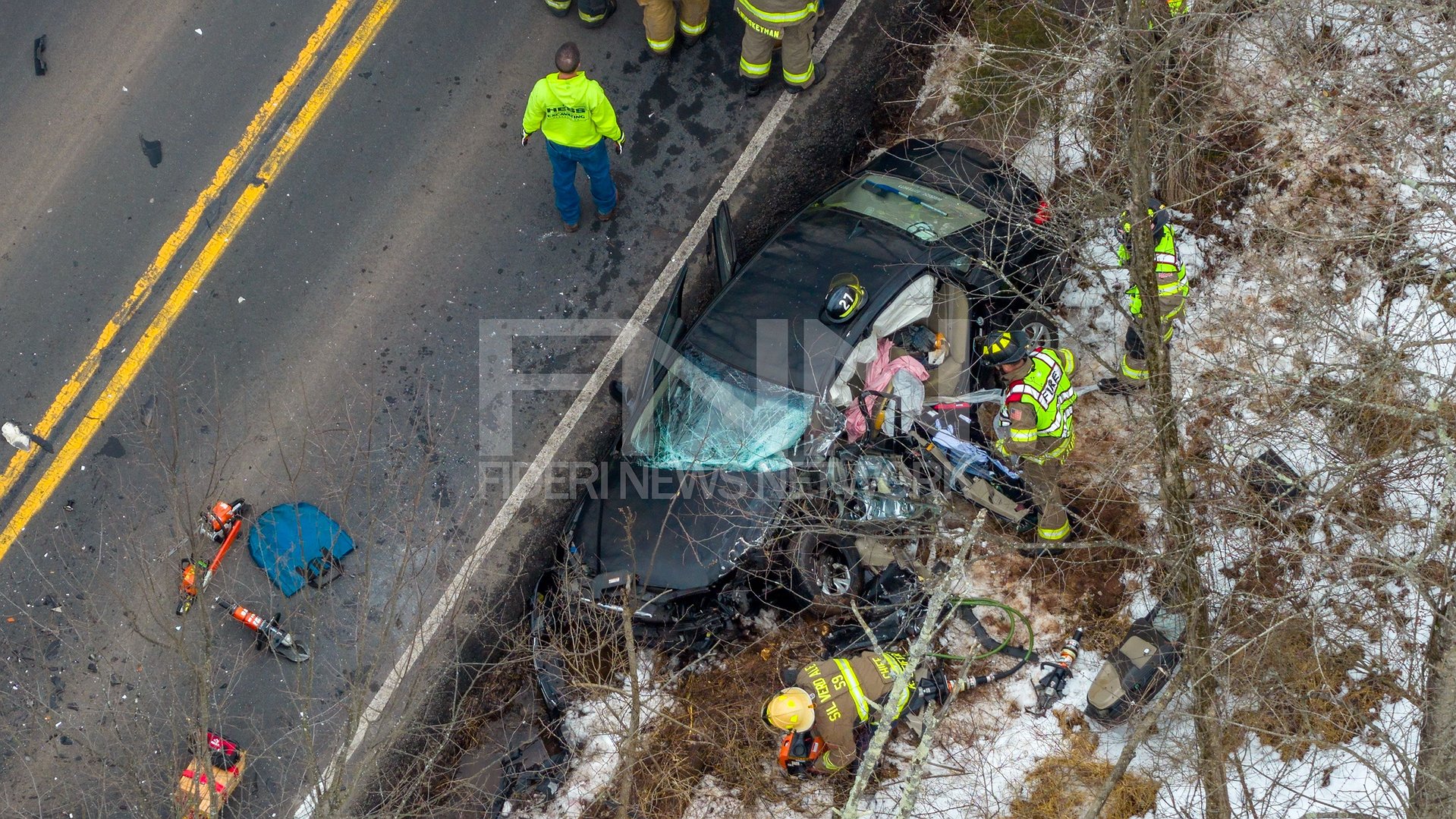Four fire agencies responded and rescued occupants from heavily damaged vehicles in a crash that shut down a stretch of Minsi Trail in Hilltown Township
