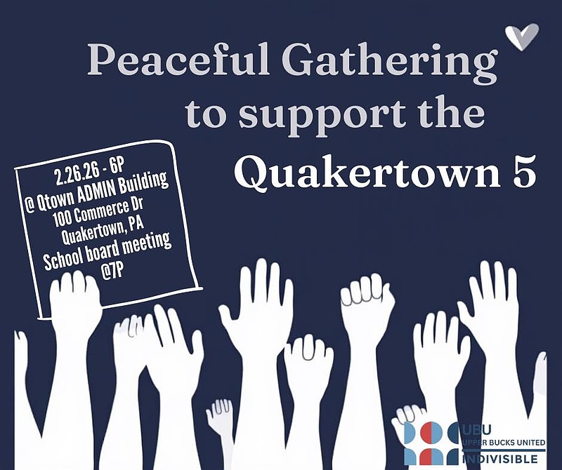 A separate “Rally for the Quakertown 5,” hosted by the Doylestown Action League, is planned for Friday at 4:30 p.m. at the corner of Court and Main streets in Doylestown Borough. Organizers say they will collect gift cards, donations, and letters of support for the families, as well as promote what they describe as First Amendment protections for student demonstrators.