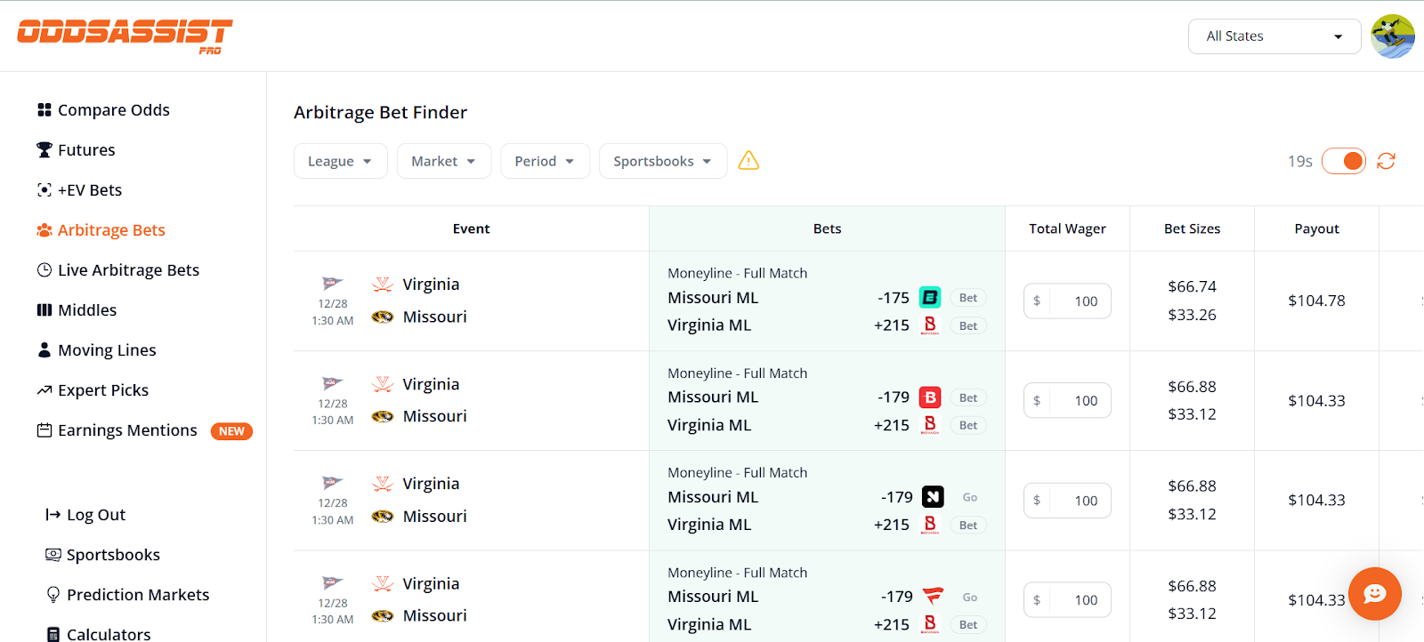 For those who enjoy live wagering at regulated U.S. sportsbooks, Odds Assist Pro’s live arbitrage bet finder is the best because it’s built for the speed that live arb betting demands and is completely free.
