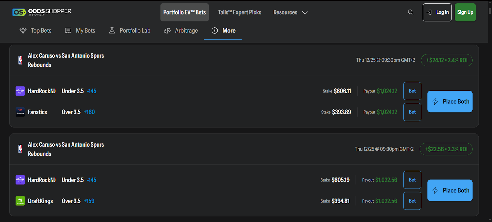 The interface is modern, clean, and really easy to browse, which is a plus when you’re trying to scan quickly. Its Place Both button is also a helpful feature for potential arbs, letting you open both sides of a bet in separate tabs with one click.