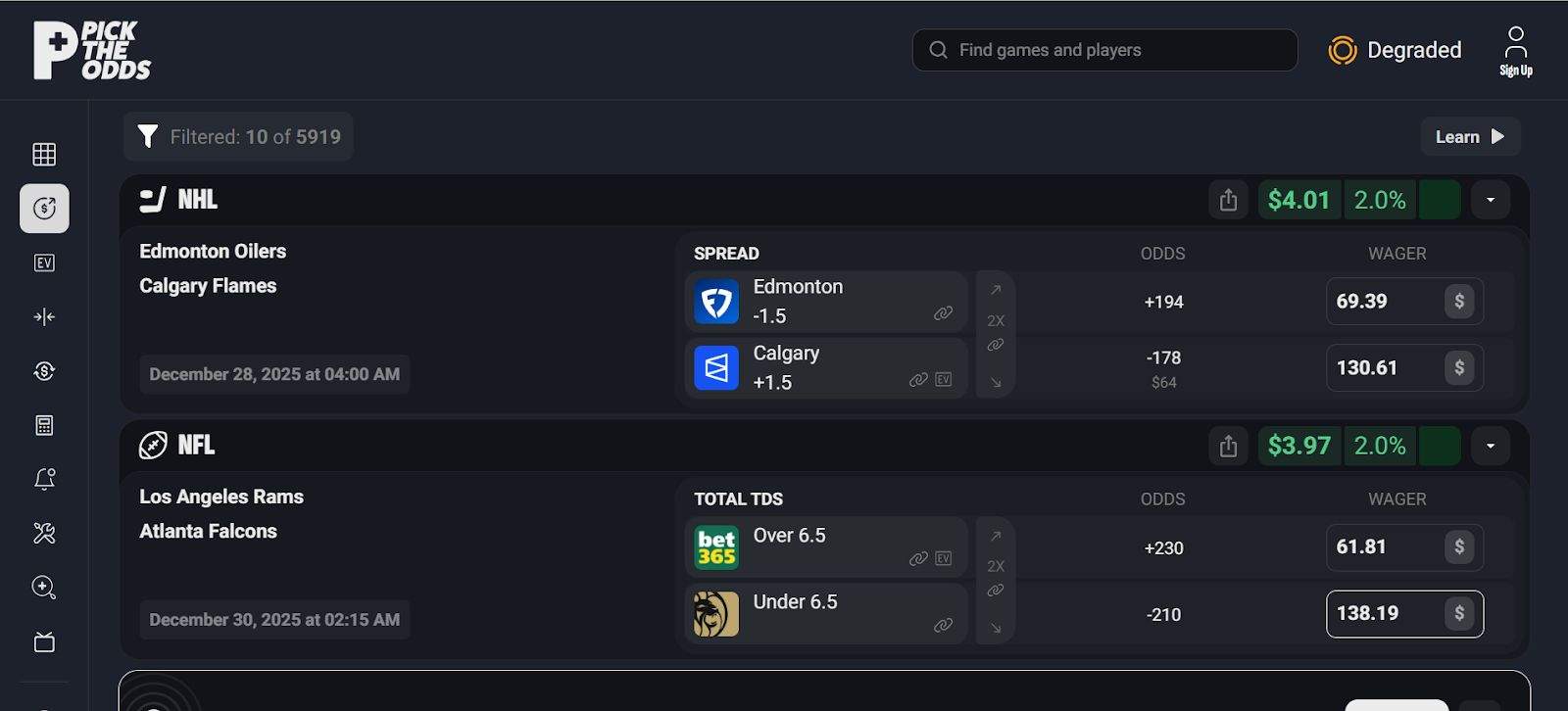It also marks overpriced outcomes with an EV icon and offers bettors next-level filtering that allows them to select finds by market type, timing, leagues, and even profitability thresholds.