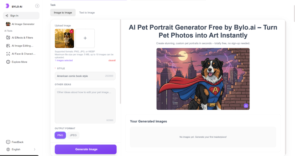 To get started, simply visit Bylo.ai’s pet portrait generator website. The platform is completely online, so there’s no need to download any software. Once on the site, you’ll find a clean, user-friendly interface that makes the entire process easy to follow.