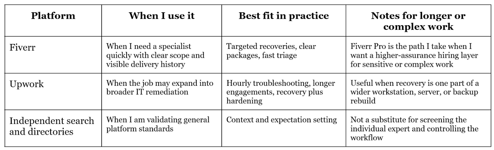 For a second option, I consider Upwork data recovery specialists when the work looks broader than recovery alone, such as recovering data and then rebuilding a workstation, reviewing backup practices, or diagnosing underlying storage health issues. That longer engagement model can be useful when recovery is only one step inside a wider remediation effort. To keep my expectations grounded, I also check reputable industry guidance for general platform signals that reduce risk, such as transparency, proof of work, and clear service positioning.