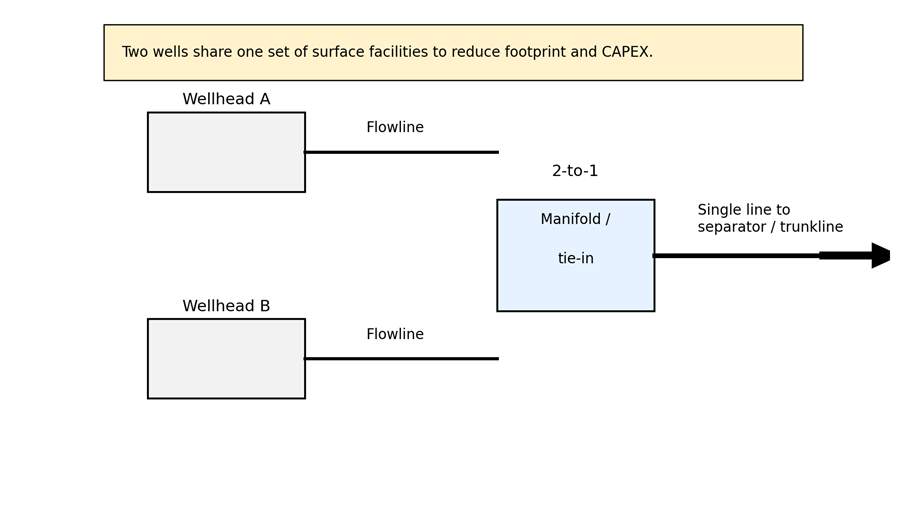 A 2-to-1 tie-in is not only about saving money. It can also simplify construction and logistics: fewer trenches, fewer runs of pipe, fewer connection points to leak, and a cleaner layout. However, sharing facilities creates trade-offs. If one well needs maintenance, the shared manifold requires careful isolation planning. The operations team must also consider how flow measurement and testing are done, because two wells sharing a line may need extra valves or procedures to separate their production streams when required.