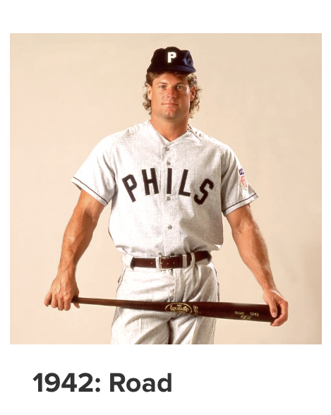However, this block P was used in various different uniform combinations during the first century of play for the Phillies. It wasn't always red, such as on the 1942 road uniforms modeled here by Darren Daulton: