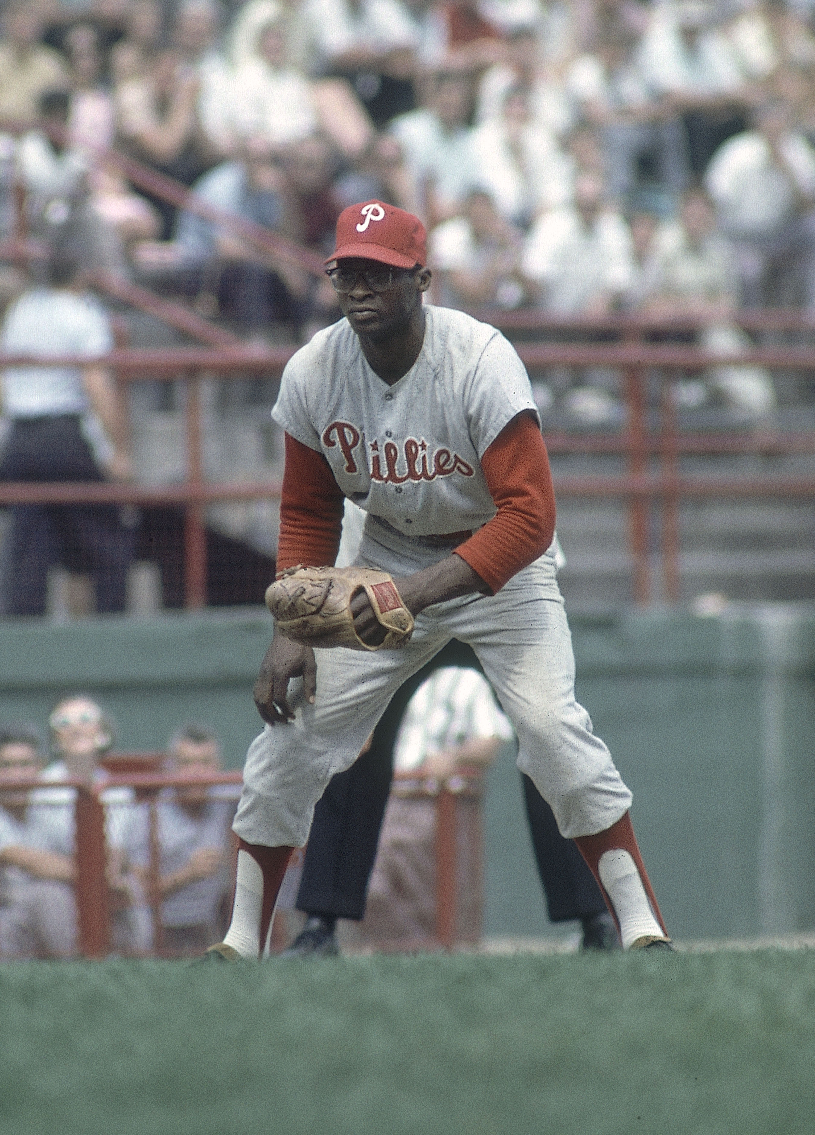 May 1965; Unknown location, USA; FILE PHOTO; Philadelphia Phillies third baseman Dick Allen in action fielding a ball. Mandatory Credit: Malcolm Emmons-USA TODAY Sports