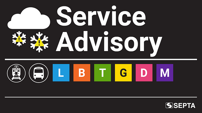 As of Sunday afternoon, all Regional Rail, bus routes, and Metro Route G1 were scheduled to be suspended. T1 service will also shut down, while the remaining trolley lines are operating on reduced service. Metro routes L, B, D and M continue to run and are identified as the most reliable options during severe winter weather.
