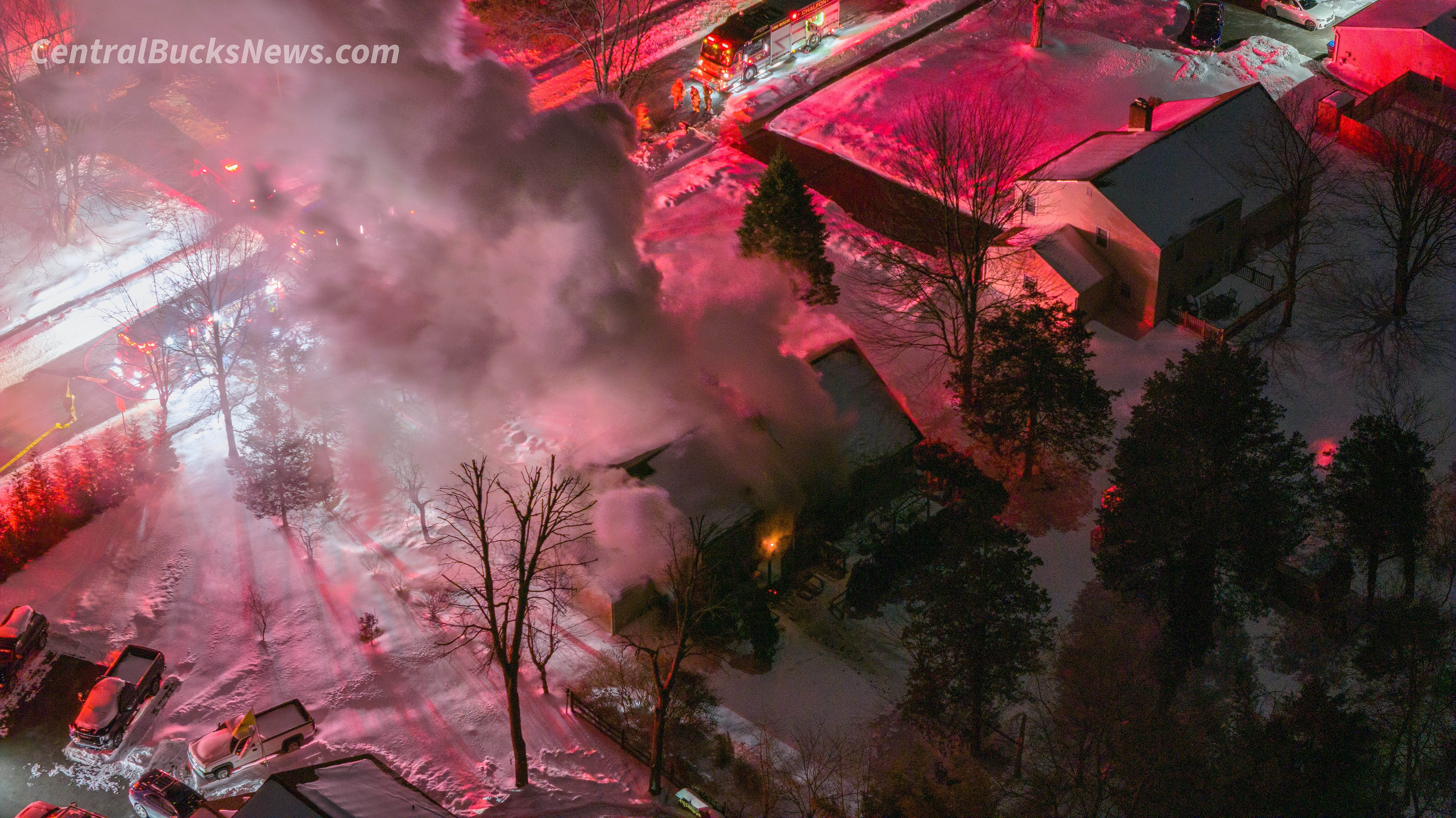 Responding agencies include Chalfont Fire Co., Hilltown Township Fire Co., Warrington Fire Co., and Colmar Fire Co. in Montgomery County. Fire Department of Montgomery Township is covering for Chalfont's station.