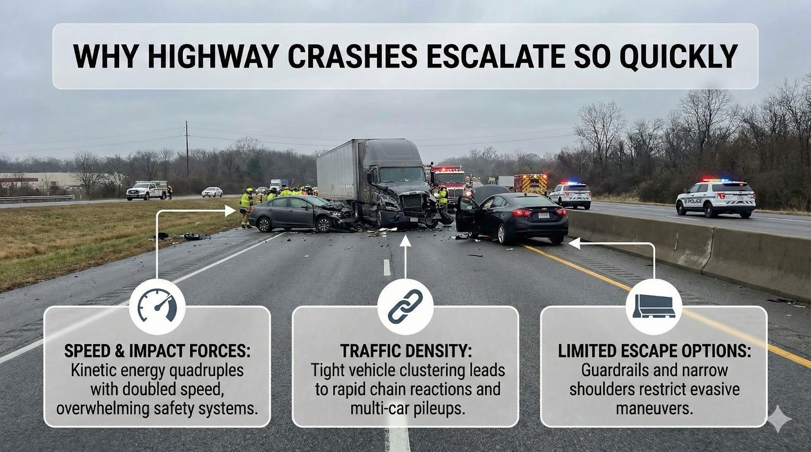 Highway crashes often involve multiple vehicles and leave little opportunity for drivers to avoid secondary impacts. The combination of speed, traffic density, and limited escape routes is what makes these collisions so devastating compared to incidents on local roads.