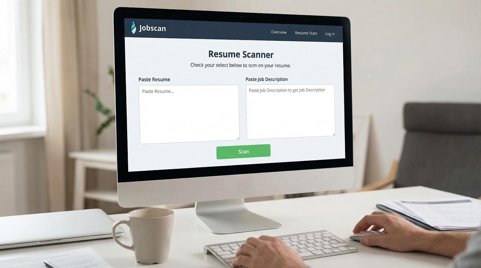Paste your résumé on the left, drop the job description on the right, and click Scan. The tool assigns a match score and shows a checklist of every keyword the posting values. Green checks mark hits, gray dashes flag gaps. Simple, transparent, and effective.