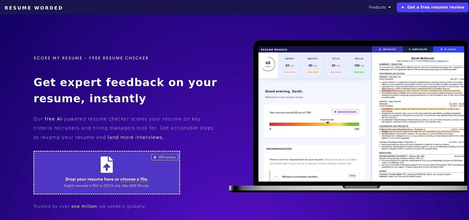 Resume Worded acts like an objective editor. Upload your résumé, click Score My Resume, and get a percentile rating plus line-by-line feedback on wording, impact, and structure.