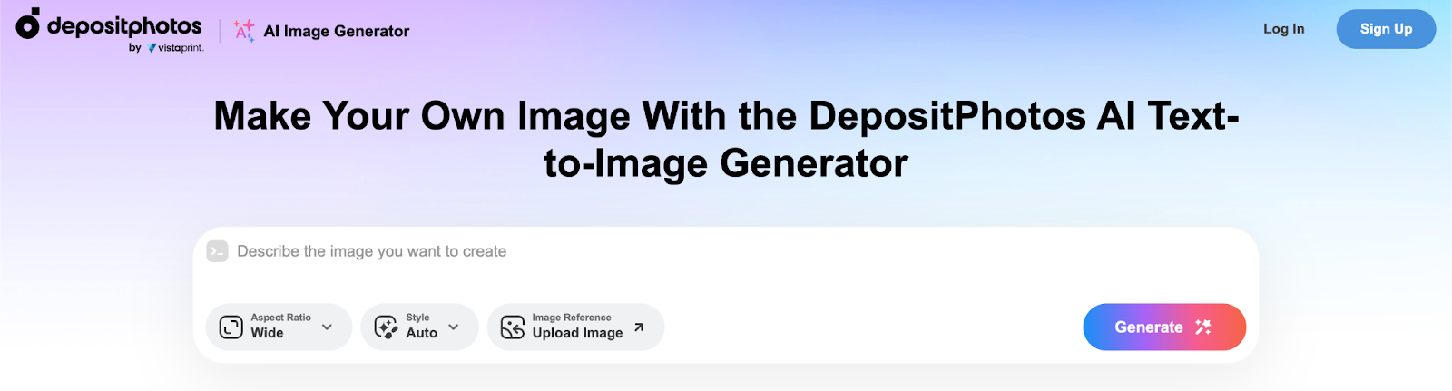 If you’re just getting started with image generation, DepositPhotos is an accessible place to begin. Its AI image generator combines a user-friendly interface with fast results and high-quality outputs. The platform also offers a trial with 10 free generations, allowing you to test the tool before committing to a subscription.
