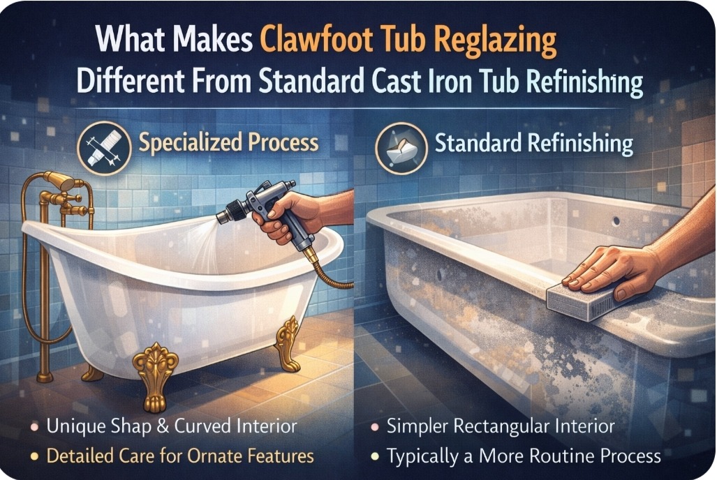 Clawfoot tubs hold a special place in older homes and historic properties. They are not just bathtubs. They are statement pieces, often passed down through generations or chosen for their classic charm. When these tubs start to look worn, many owners assume the refinishing process is the same as any other cast iron tub. That assumption leads to mistakes. Clawfoot tub reglazing requires a very different approach from standard built in cast iron tub refinishing, and understanding those differences helps protect both the tub and its value.
