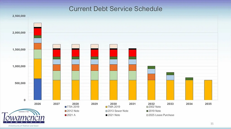 Last fall the township held a series of budget workshops that resulted in a 2026 budget with the township’s first tax increase in three years, and heard details on a list of roughly $10.7 million in total capital project requests from department heads, including $4.6 million for the township’s sewer plant and infrastructure, another $2.3 million for stormwater work, and just over $1 million each for roadwork and park projects. Any new debt would wrap around the township’s existing debt schedule, with payments scheduled to fall off over the next few years on bonds issued as far back as the early 2000s.