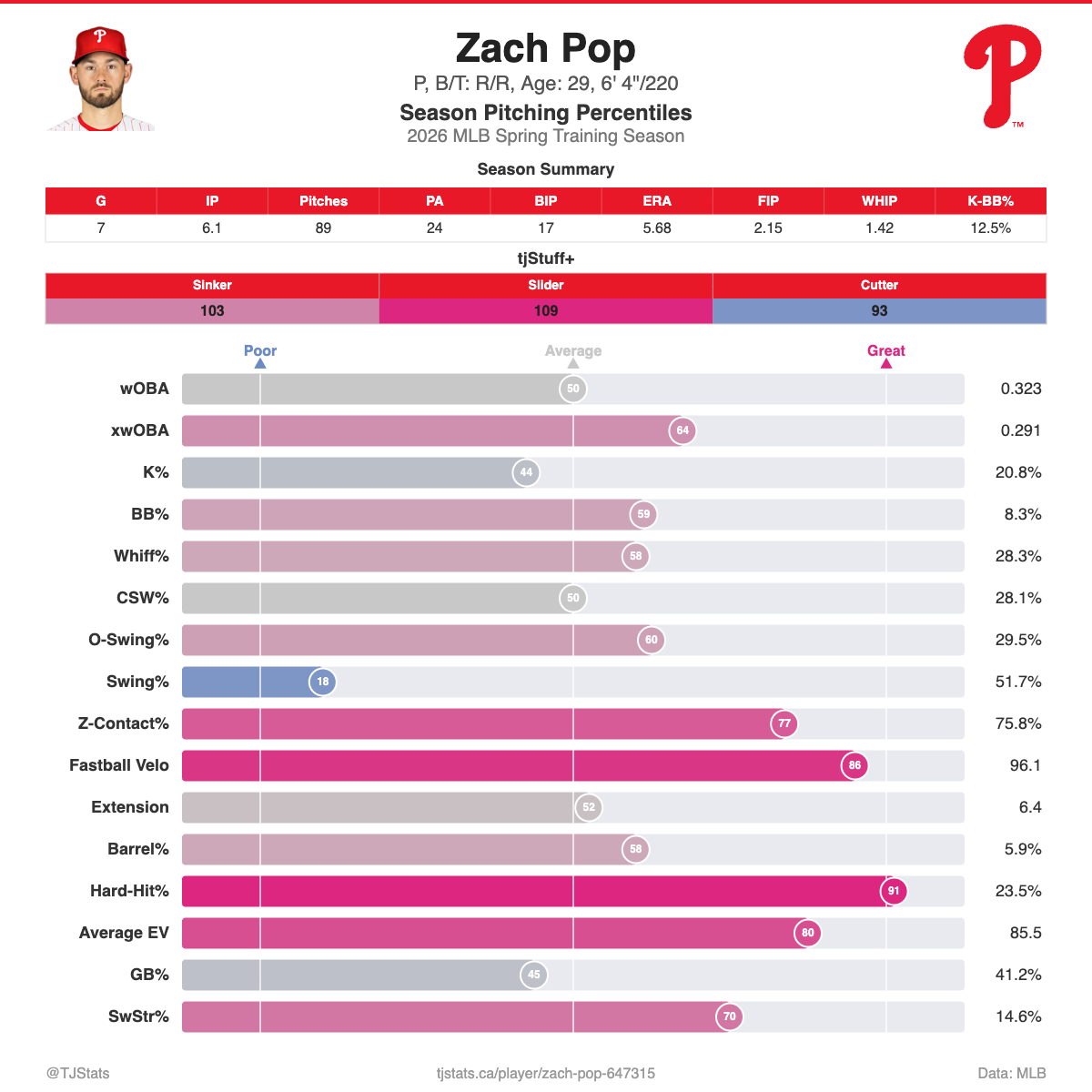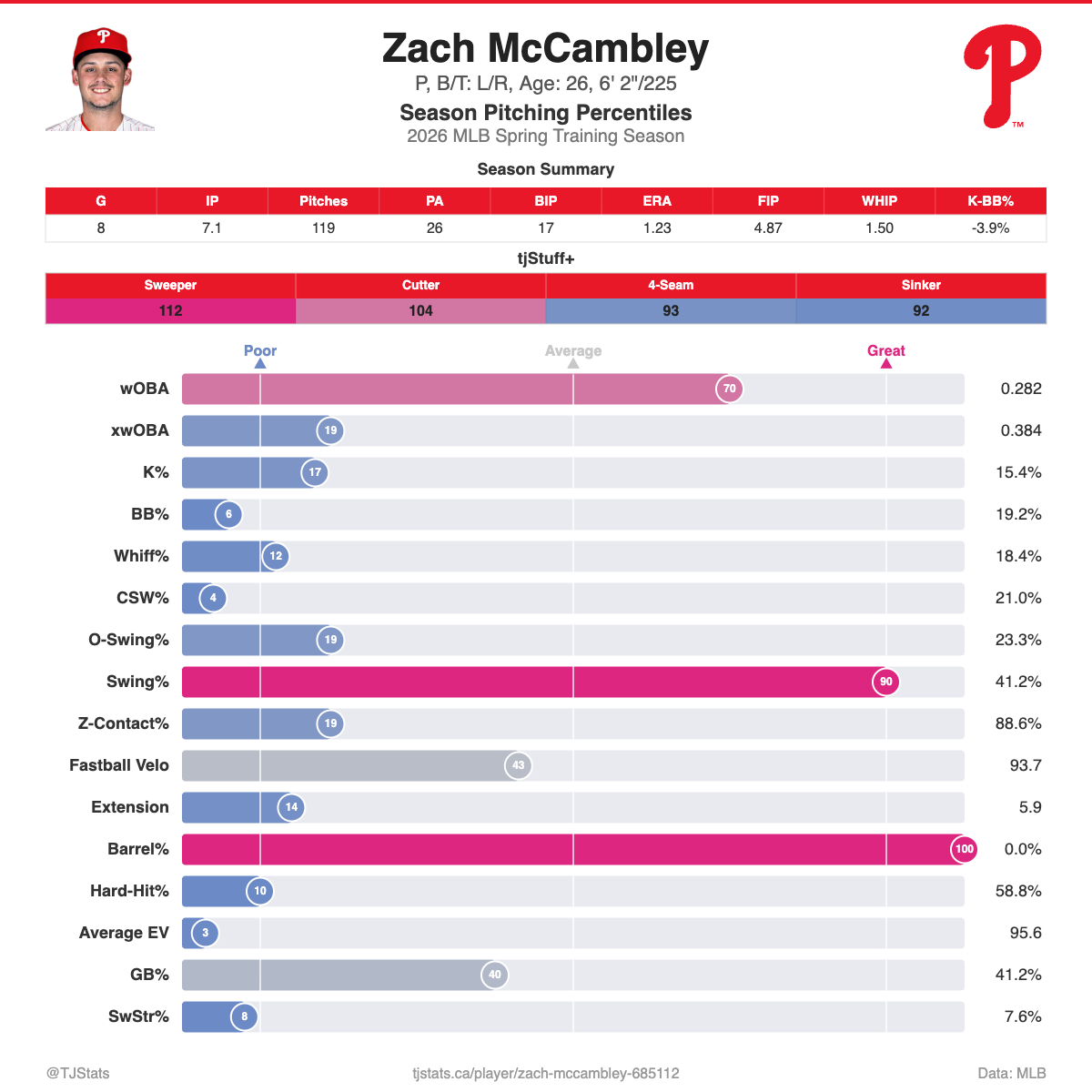 • Zach McCambley vs. Zach Pop might be the battle for the final bullpen spot. The former has a 1.23 ERA over 7 1/3 innings pitched this spring, as opposed to a 5.68 ERA in 6 1/3 for the latter. With that said, all four of Pop's earned runs came in one outing. The following charts from TJ Stats show the latter's stuff has graded out better: