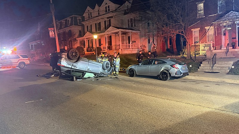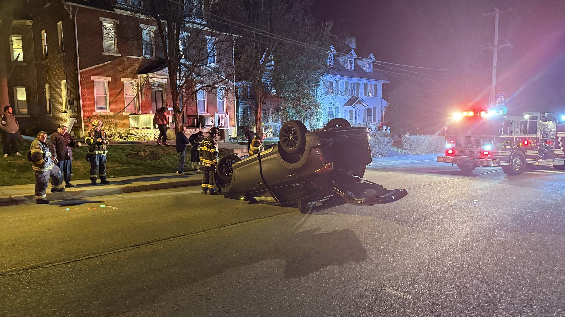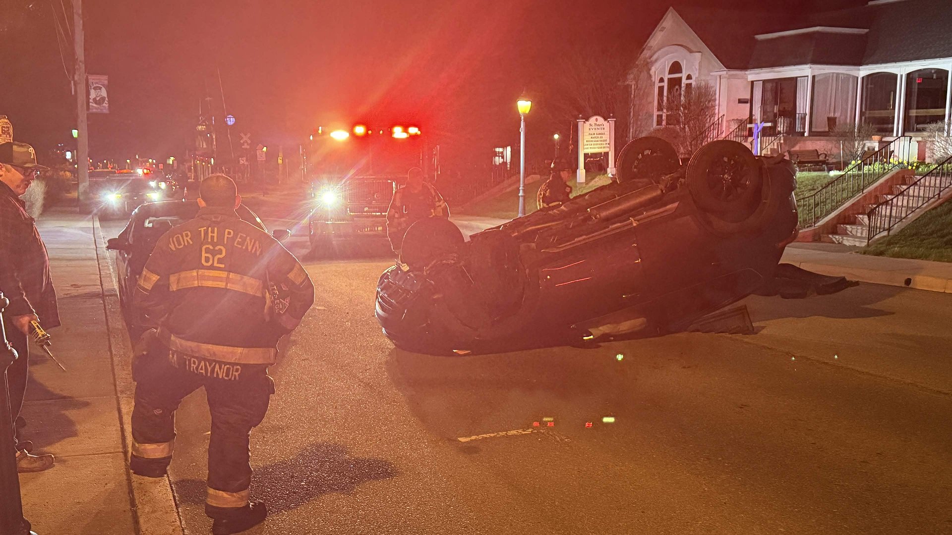 The incident occurred around 10:14 p.m. in front of St. Peter’s Lutheran Church at 211 S. Main St. (Sumneytown Pike), according to emergency dispatch reports. Initial calls indicated a gray SUV had collided with a gray Honda Civic parked along the curb before flipping onto its roof.